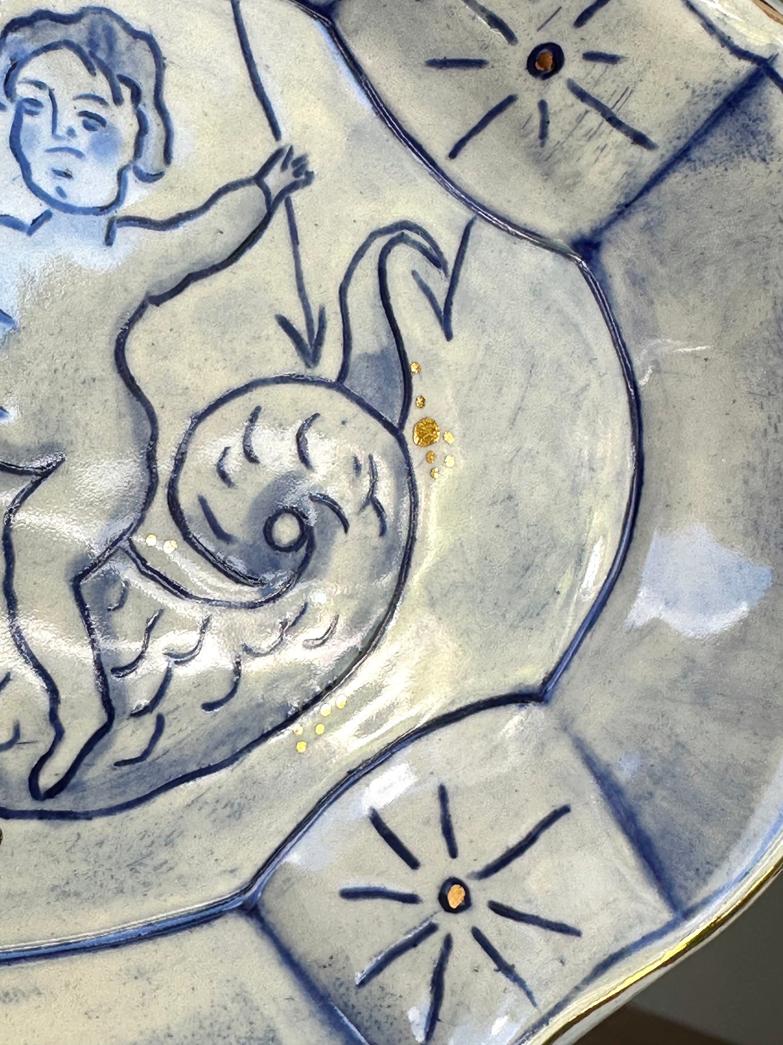 Putti, the wingless counterparts to cherubs, appear throughout Portuguese azulejos as playful symbols of earthly joy and beauty. Borrowed from Renaissance and Baroque art, these small, childlike figures embody innocence, love, and the pleasures of life. In tile panels, they dance through garden scenes, ride sea dragons, cradle garlands, or hold emblems of music and festivity. Unlike their celestial cousins, the putti belong to the human world, capturing moments of warmth and delight within the cool blue of glazed tile.